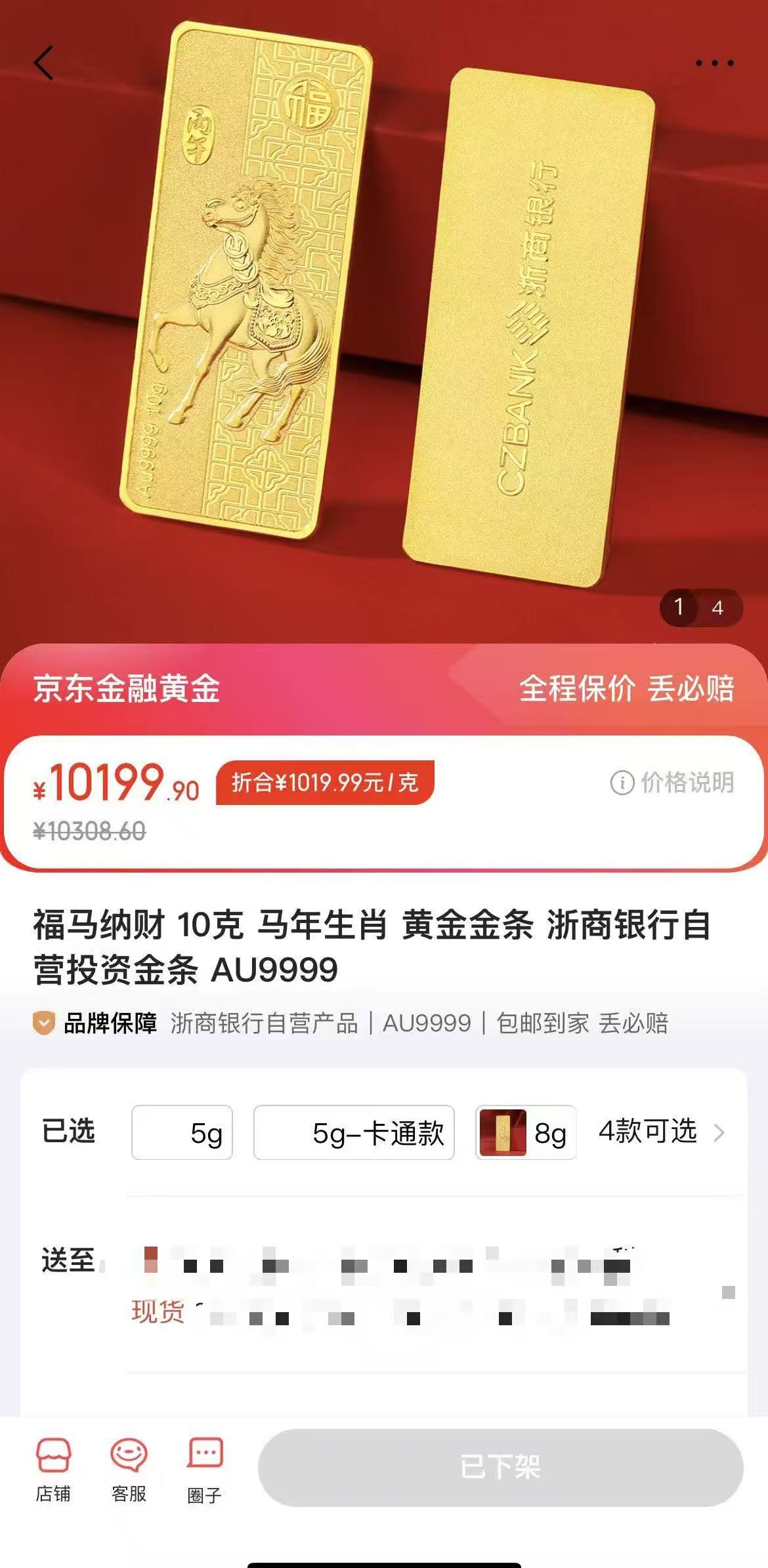 为何下架10克规格金条?中新经纬以投资者身份咨询京东金融客服,一位工作人员表示,目前因金价上涨,浙商银行和民生银行的10克实物金金条已突破1万元/件,受限于Ⅱ类电子账户每日1万限额,用户已无法交易。银行侧对10克金条进行了下架处理。后续如果金额跌回到990元/克下并稳定后,银行侧会再恢复上架。