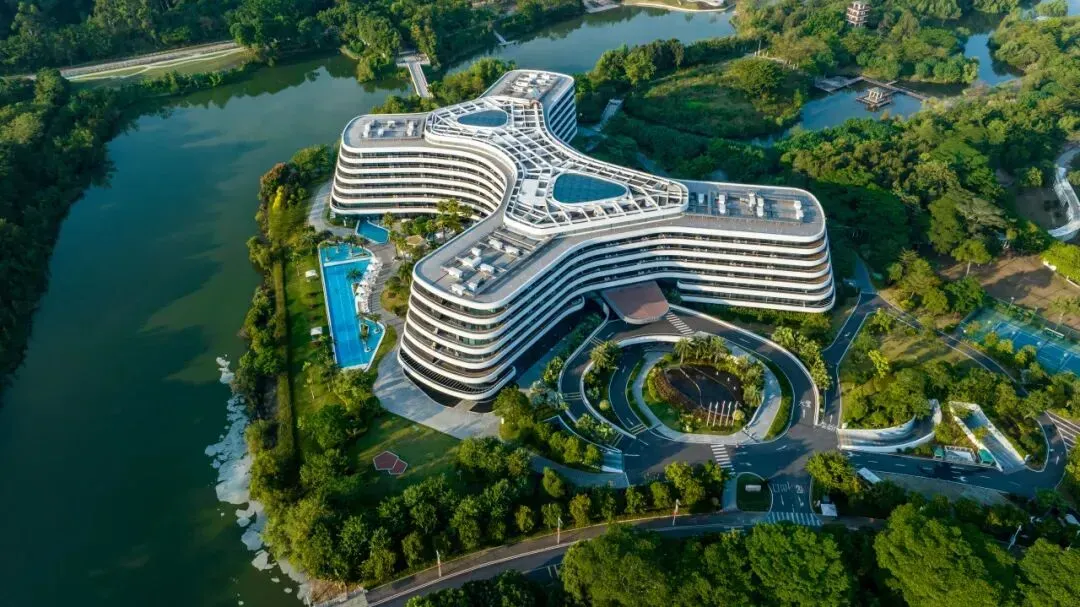 该酒店位于南沙湾,背靠蒲洲山,面向珠江出海口,南望伶仃洋,23公顷园林环绕,是南沙湾的标志性建筑之一,与南沙客运港、南沙国际邮轮母港、广州地铁4号线南沙客运港站相邻,通达港澳、国际航线。距2026年大湾区灯会主入口近在咫尺,步行即可到达。